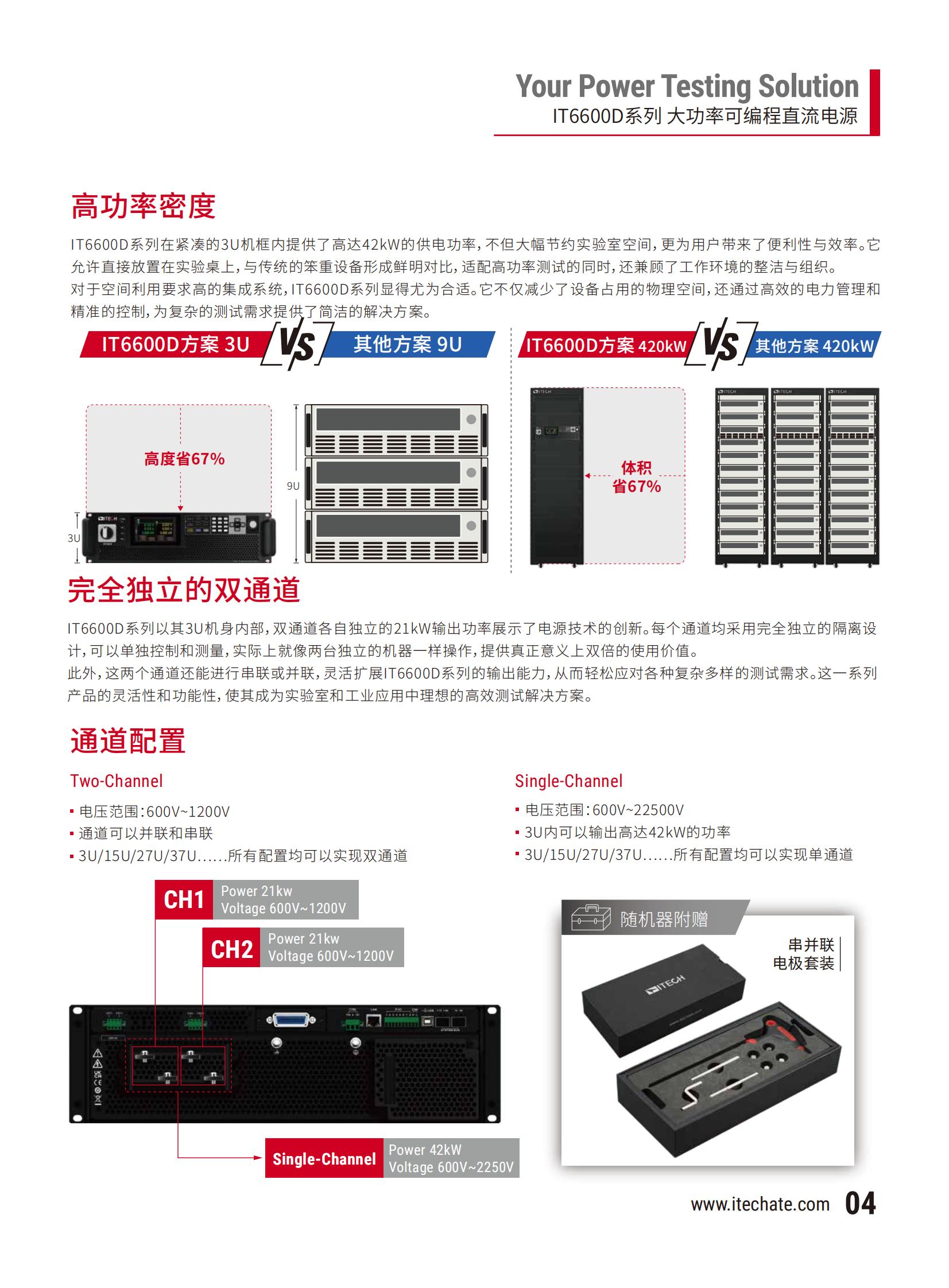 IT6600D系列引领了新一代图形化的可编程直流电源,通过整合触摸屏设计和直观的图形操作界面,不仅简化了参数设置和波形编辑过程,而且显著提高了用户操作的便捷性。采用了先进的第三代SiC技术。仅3U的机框内实现了双通道各21kW的高功率密度设计,独立的两个通道通过串联&并联,输出更可高达42kW,一台设备就能竞品3`5台的输出范围,满足多种高电压和大电流应用需求,提高了测试和开发的灵活性与效率。