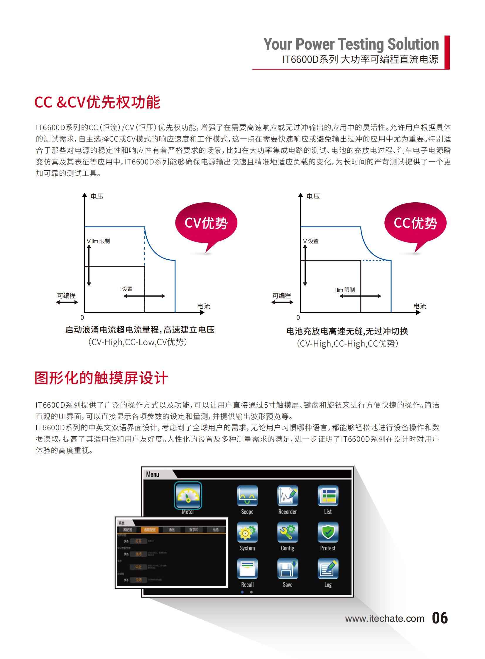 IT6600D系列具有CC(恒流)/CV(恒压)优先权的特性允许用户根据被测物的特定需求来选择输出模式,这种灵活性在进行精密测量时尤其重要。配合高精高速的产品特性以及多种标准通讯接口,简化和加快了测试开发,广泛适用于在实验室、生产线和自动测试系统用满足多元的测试应用。