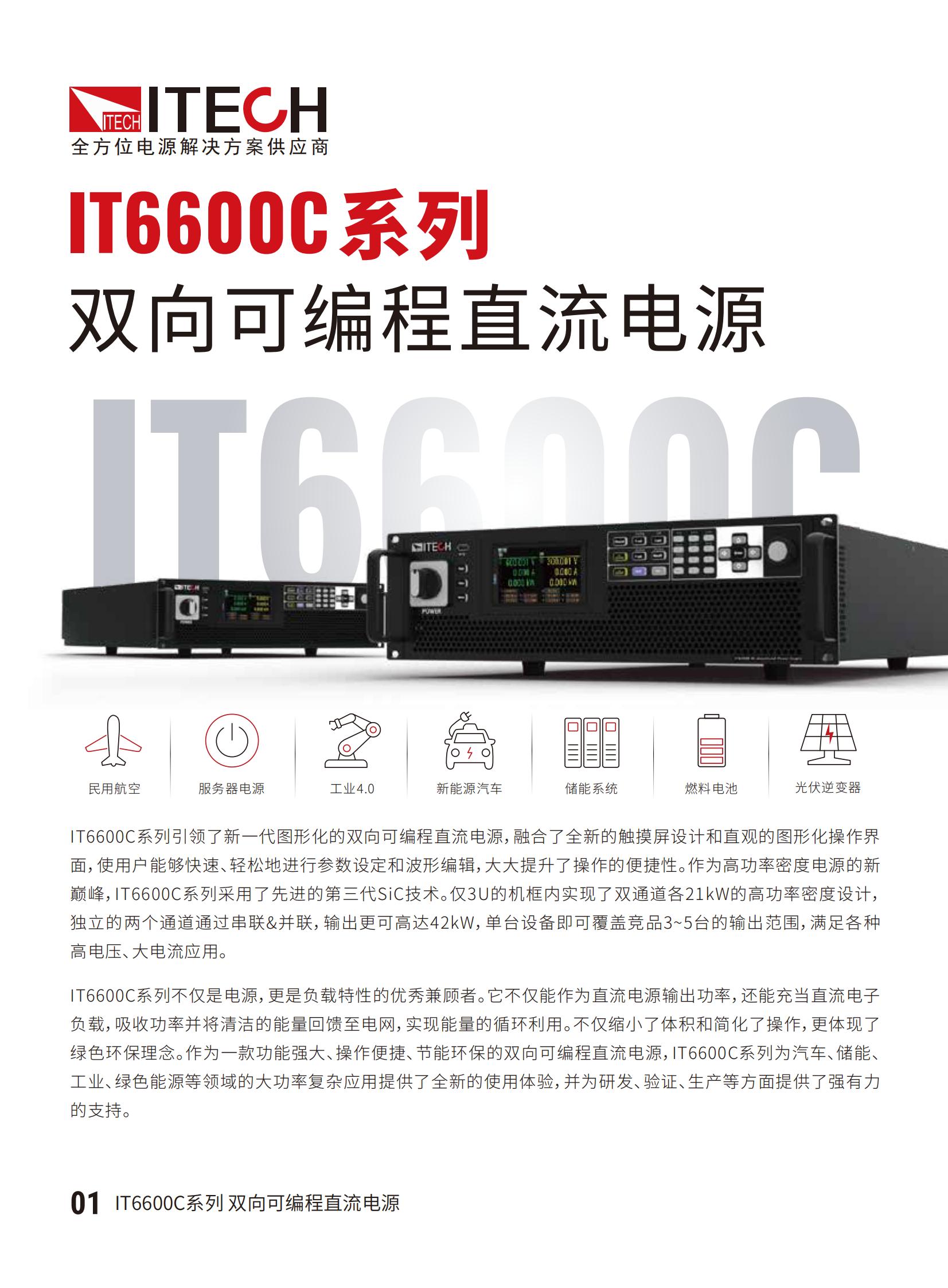 IT6600C系列不仅是电源,更是负载特性的优秀兼顾者。它不仅能作为直流电源输出功率,还能充当直流电子负载,吸收功率并将清洁的能量回馈至电网,实现能量的循环利用。作为一款功能强大、操作便捷、节能环保的双向可编程直流电源,IT6600C系列为汽车、储能、工业、绿色能源等领域的大功率复杂应用提供了全新的使用体验,并为研发、验证、生产等方面提供了强有力的支持。