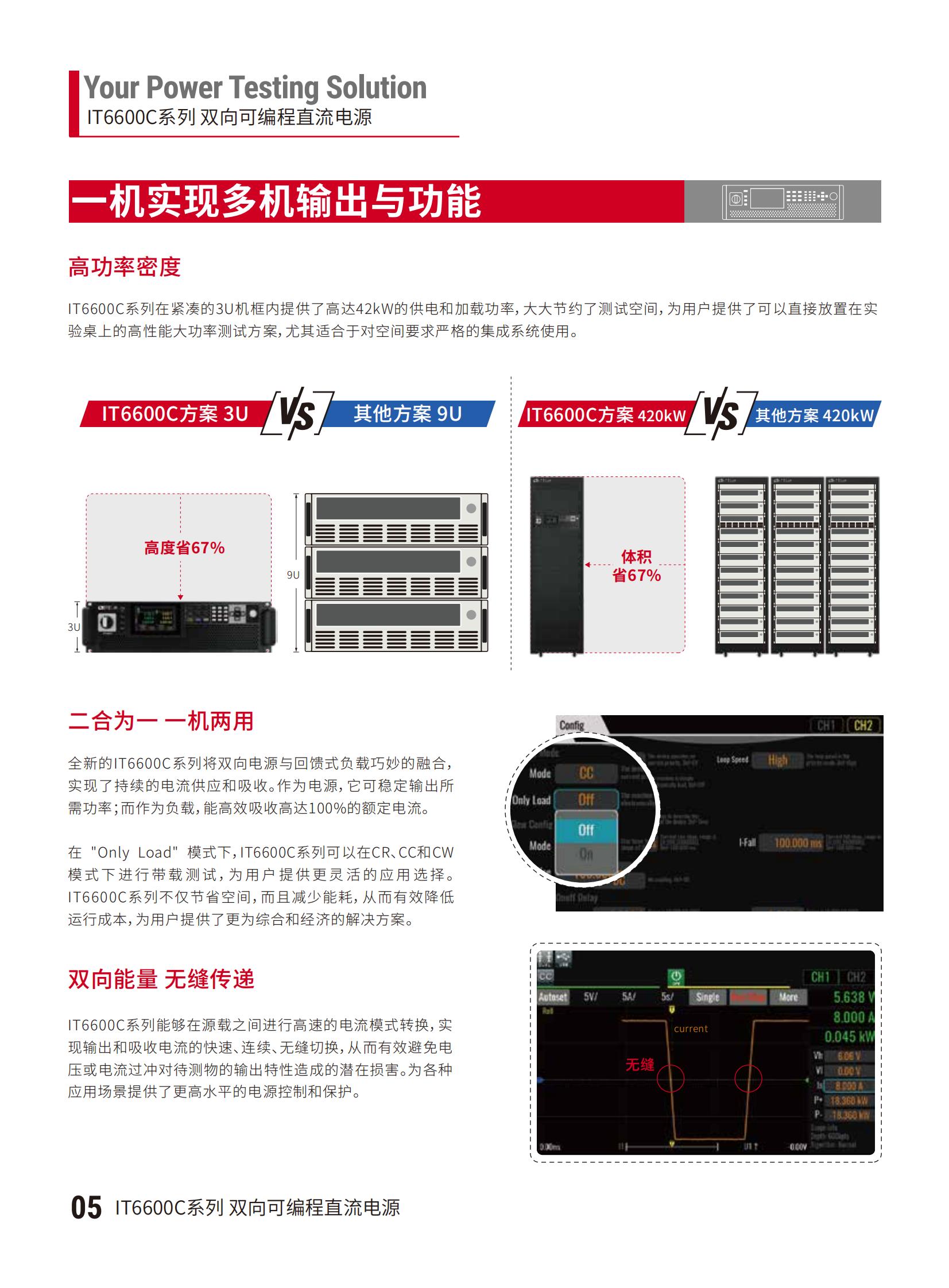 IT6600C系列融合了全新的触摸屏设计和直观的图形化操作界面,使用户能够快速、轻松地进行参数设定和波形编辑,大大提升了操作的便捷性。仅3U的机框内实现了双通道各21kW的高功率密度设计,独立的两个通道通过串联&并联,输出更可高达42kW,单台设备即可覆盖竞品3~5台的输出范围,满足各种高电压、大电流应用。